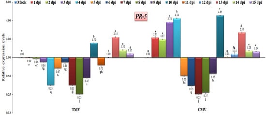 Concerning PR-5, it encodes a thaumatin-like protein, is present in cell vacuoles, and has antifungal activities []. PR-5 is activated by the host plant against a wide range of pathogens, and it is thought to be a basal resistance protein [,]. In the current study, the PR-5 gene exhibited down-regulation at almost all time intervals after TMV infection, except at 10, 13, 14, and 15 dpi, with relative expression levels that were 1.72-, 2.15-, 1.32-, and 1.15-fold higher than the control, respectively (Figure 8). In the current study, the PR-5 gene had a low expression level at 1 to 9 dpi with a range of 0.25- to 0.96-fold in TMV-infected tomato plants (Figure 9). However, the highest expression level of PR-5 was observed at 13, 14 and 15 dpi, with values of 2.15-fold, 1.32-fold, and 1.15-fold, respectively. Compared to the TMV-infected tomato plants, the CMV-infected tomato plants showed PR-5 expression at 1 dpi, which was 2.11-fold higher than the control (Figure 9). Additionally, the PR-5 gene reached its highest level of expression after it increased by 4.34-fold at 4 dpi. After that, the gene expression decreased and fell from 0.67-fold to 0.47-fold at 5, 6, 7, 8, and 9 dpi. We suggest that in this study, the viral infection switched off the PR-5 gene expression in this time period, which then highly increased to 4.85 at 10 dpi (Figure 9). It was reported that the virus infection had a moderate effect on PR-5 expression []. The up-regulation of PR-5 induces resistance in tomatoes, resulting in delayed symptom appearance and tomato spotted wilt virus accumulation []. The overexpression of PR-5 in tobacco-vein-banding-mosaic-virus-infected tobacco plants and beet-severe-curly-top-virus-infected Arabidopsis has also been observed [,]. Similar results were reported by Wang et al. [], who noticed that infection with the turnip crinkle virus resulted in an increase in PR-5 expression. In addition, the rice dwarf virus also leads to the activation of the PR-5 gene, suggesting that the PR-5 domain might bind a polypeptide ligand and raising the possibility that mature PR-5 proteins may also interact with polypeptides [].
