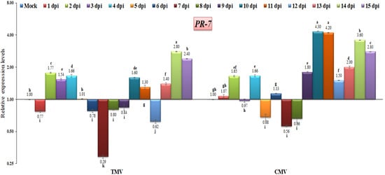 Comparison between the relative transcriptional levels of the tomato PR-7 gene in TMV- and CMV-infected tissues compared to control at 1 to 15 dpi. The columns show the mean value from five biological replicates, and the bars represent the standard deviation (SD). Means were distinguished using Tukey’s HSD test at p ≤ 0.05 levels, and small letters are used to represent differences. Columns of data showing different letters are significant.