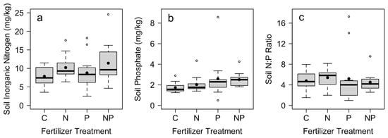 Mean total soil (a) inorganic nitrogen and (b) phosphate nutrient concentrations, and (c) soil N:P across control (C), nitrogen (N), phosphorus (P), and nitrogen and phosphorus (NP) fertilizer treatments (n = 12). Mean soil nutrient concentrations were measured in December at the end of the study, with fertilizer applications in July and October. Box plots indicate median (thick line), 1st and 3rd quartiles (grey box), and range whiskers, with extreme values as open circles. Filled circles indicate the mean. See Table 1 for associated statistics.
