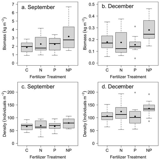 Mean Saccharum spontaneum above-ground biomass in (a) September and (b) December (note different scales) across control (C), nitrogen (N), phosphorus (P), and nitrogen and phosphorus (NP) nutrient treatments (n = 12). Mean stem density in (c) September and (d) December. Box plots indicate median (thick line), 1st and 3rd quartiles (grey box), and range whiskers, with extreme values as open circles. Filled circles indicate the mean. See Table 2 for associated statistics.