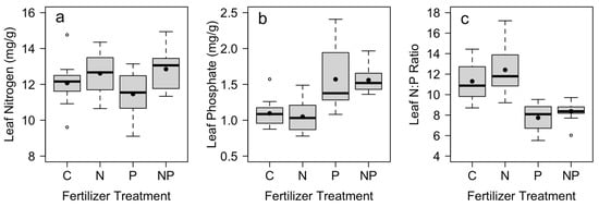 Mean leaf concentrations of (a) nitrogen and (b) phosphorus, together with (c) leaf N:P ratio across control (C), nitrogen (N), phosphorus (P), and nitrogen and phosphorus (NP) fertilizer treatments (n = 12). Mean leaf nutrient concentrations were measured in December at the end of the study, with fertilizer applications in July and October. Box plots indicate median (thick line), 1st and 3rd quartiles (gray box) and range whiskers, with extreme values as open circles. Filled circles indicate the mean. See Table 2 for associated statistics.