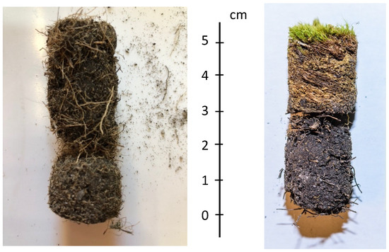 Initial soils on acidic (Left) and calcareous (Right) ledges sampled by two student mountaineers [9,10]. The centimeter scale bar shown in the center applies to both images. These profiles were obtained from vertical rock faces at an altitude of about 2000 m by driving a tube into the ground supported with ledges 50–150 cm wide. In the photo on the left, we can see the organic part matted with roots (OH), which is detached from the slightly lighter organo-mineral part (A) and resting on the rock; on the right, detachment occurs between a light brown organic part made of decomposing moss (OF) and a darker organic part in contact with the rock (OH). These micro-soils rested on a fragmented rock horizon that was not picked up with the probe (C horizon). These profiles illustrate the early stages of soil formation in an untouched, high-altitude environment. The diagnostic horizons are composed of arthropods and enchytraeids excrements, grains of fragmented rock and shredded and decomposed organic matter, owing to the action of bacteria and fungi.