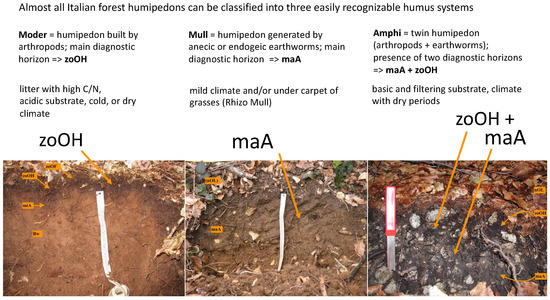 The four Amphi humus forms (Leptoamphi, Eumacroamphi, Eumesoamphi, Pachyamphi), identified in the Amphi humus system using the thickness of the OH horizon and the structure of the A horizon [6], can be grouped into two main functional categories. The Bipolar Amphi forms evolve continuously between the Mull and Moder or Tangel humus forms, sometimes in the direction of Mull and sometimes in the direction of Moder or Tangel. They are characterized by the perturbation of large earthworms, which release their biomacrostructured organo-mineral excrements into the organic layers, orienting the evolution in two opposite directions: toward Mull (Leptoamphi) when the excrements increase and toward Moder when instead they decrease (Eumacroamphi, with thicker OH). The Stable Amphi forms are stable intermediates between Moder or Tangel and Mull, reflecting an incomplete but homogeneous organo-mineral incorporation. They generate a holorganic horizon above (OH) and a biomesostructured or a mixed biomeso- and biomicrostructured organo-mineral horizon (meA) below (Eumesoamphi, or Pachyamphi with thicker OH).