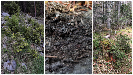 Examples showing subalpine forest regeneration sites on a scree slope. (Left): on weakly stabilized skeletal soil. (Center): the few-centimeters-thin A horizon of a Mull system on skeletal soil on and between blocks of rock in Grand Follié forest—1550 m, Saint Foy Tarentaise, France. (Right): on a stump, i.e., an example of a 50 cm thick Ligno humus form (Somadida forest—1300 m, Auronzo, Italy).