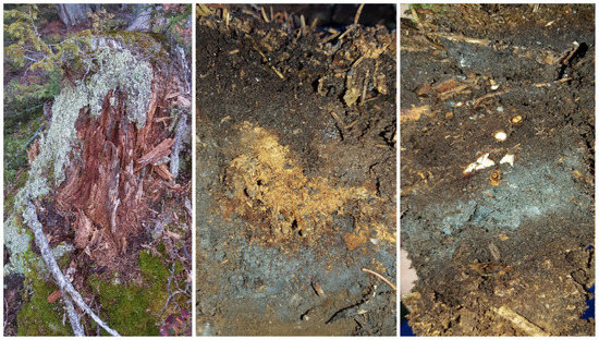 - McFee, W.W.; Stone, E.L. The Persistence of Decaying Wood in the Humus Layers of Northern Forests. Soil Sci. Soc. Am. J. 1966, 30, 513–516. [Google Scholar] [CrossRef]