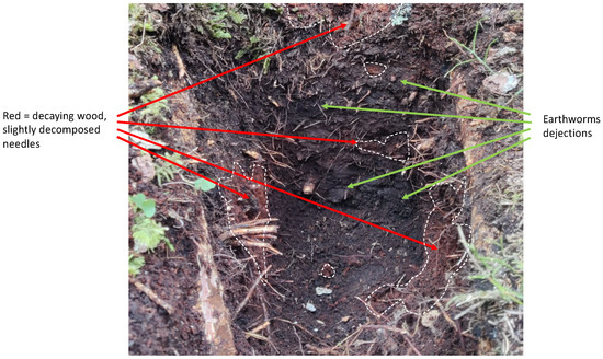 In the subalpine belt, there are many reasons why minerals come close to the surface. The most effective is indeed the burrowing of earthworms (Figure 4 and Figure 5, in Section 4.1), but it can also be the consequence of other biological activities as diverse as wild boars [65], tree uprooting [66,67], millipede activity [68], small mammals [69] and human digging of forest roads [65,70]. It can also have a physicochemical origin, such as an alteration to the bedrock of a small overhanging cliff and the subsequent debris on steep slopes. All these are drivers of humus form change, leading to a mineral enrichment near the surface that supports forest regeneration. However, such mineral input in a holorganic humus form is often discontinuous in space and time, or, if bioturbation is generalized, it is present at low levels in subalpine forests [71]. In contrast to lowland forest bioturbation, which produces the Mull humus form, low-level and/or episodic bioturbation in mountain environments produces a range of Amphi humus forms.