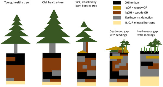 The death of the trees is not a loss to the forest; instead, the actual functioning of a forest ecosystem and its biodiversity is hindered by the lack of decaying wood [84]. Like all other organisms that die, decaying trees feed the soil, which returns this organic matter after having been transformed into building blocks for a new complex part of the forest. We are currently comparing the morphological characteristics of Humipedon found under trees attacked by spruce bark beetles and under healthy trees (Figure 9). As the forest opens up due to the loss of canopy cover, the Humipedon receives more light in addition to the dead organic matter. The above-mentioned change in the Humipedon is triggered by the arrival of earthworms, which cause the integration of organic matter into organo-mineral aggregates and the progressive disappearance of OH horizons. This phenomenon can be observed with the naked eye in the forest. With the arrival of bark and wood from dead trees, the conditions of Humipedon resemble those found near old stumps. These conditions are known to stimulate forest regeneration (Figure 9).