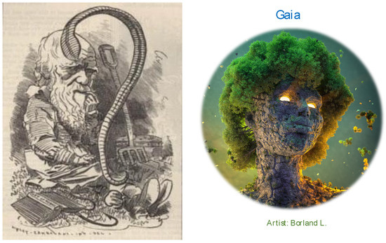 (Left): Linley Sambourne’s satiric portrait of Darwin, published in Punch, 1881 (Punch’s funcy portraits n. 54: https://www.meisterdrucke.fr/fine-art-prints/Edward-Linley-Sambourne/1045006/Charles-Darwin-%281809-1882%29-Naturaliste-anglais.-L%27%C3%A9volution-par-la-s%C3%A9lection-naturelle.-Caricature-d%27Edward-Linley-Sambourne-%281844-1910%29-dans-la-s%C3%A9rie-Fancy-Portrait-de-Punch,-Londres-1881,-ann%C3%A9e-o%C3%B9-Darwin-a-publi%C3%A9-The-Formation-of-Vegetable-Mould-through-.html, accessed on 24 June 2023). Note that the earthworm was depicted as a question mark, with its flattened tail mimicking the head of a potentially dangerous cobra. (Right): James Lovelock’s Gaia is a scientific hypothesis only for blind scientists. We like to present Lokio Borland’s captivating depiction of Gaia (https://lokio.artstation.com/projects/zgxJD, accessed on 24 June 2023) alongside the historical and dubious, but still modern, Darwin.