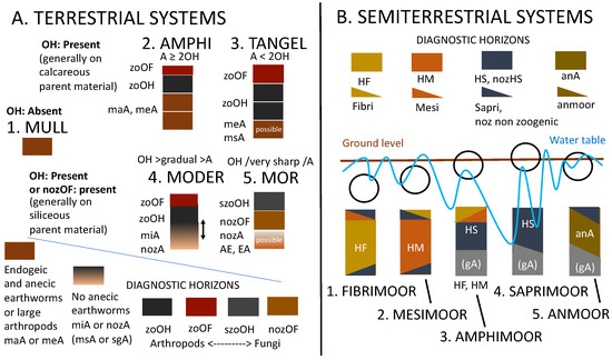 Synthetic keys for the classification of Humipedons in reference humus systems for terrestrial environments (non-asphyxiated soils) or for semiterrestrial environments (more or less submerged soils, peats). Modified from Zanella et al. [6] with permission. These keys are based on the recognition of diagnostic horizons. The superimposed set of these horizons corresponds to a function of the Humipedon, in harmony with the rest of the soil, with the vegetation and climate of those environments. Summary legend: Horizons of Humipedon: Terrestrial (aerated) organic horizons: OL, OF, OH + organo-mineral horizons: A; Semiterrestrial (more or less submerged) organic horizons: HF, HM, HS + organo-mineral horizons: A. Meaning of lowercase letters applied as prefixes to diagnostic horizon codes: zo = zoogenic, noz = non-zoogenic, szo = weakly zoogenic, an = of Anmoor, ma = biomacrostructured, me = biomesostructured, mi = biomesostructured, ms = massive, sg = single-grain. Meaning of the initial part of the name of semiterrestrial systems: Fibri = generally submerged and very fibrous, Sapri = completely transformed into organic pulp, Mesi = transition between Fibri and Sapri, Moor = peats. About the relative thicknesses of the horizons and the accuracy of the transition between them: A ≥ 2 OH: thickness of the A horizon ≥ 2 times that of the OH; A < 2 OH: thickness of the horizon A < 2 times that of the OH; OH < gradual A: gradual transition between OH and A, inaccuracy > 5 mm; OH/net/A: sudden transition between OH and A, inaccuracy < 3 mm.