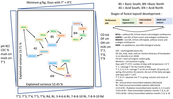 Humus systems in the development stages of an uneven spruce forest in acidic environments, facing south (AS) or north (AN), or in a basic environment facing south (BS) or north (BN). Notice how the humus system changes cyclically. In the Amphi and Mull systems, there are earthworms (with A horizons similar to those of the home garden); in the other systems, the earthworms are replaced with enchytraeids and arthropods, which form much more organic horizons, similar to those of shredded tobacco. The variance explained by the model presented on the plane of two axes (whose principal components are listed with increasing or decreasing importance along the axis) is about 68%.
