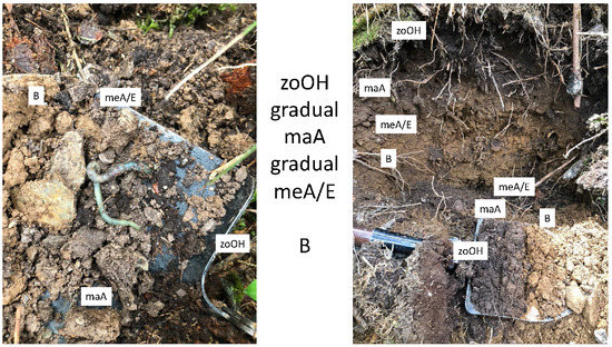 Forest regeneration is the main driver of the Bipolar Amphi system, limiting the duration and the extent of Mull humus to old-growth eco-units and clearings [72]. This does not mean that Bipolar Amphi has nothing to do with climate, although it is possible to find a similar limitation in lowland forests [77]. However, the regeneration niche does not exactly coincide with the Mull or Amphi systems because of the beneficial role of decayed wood [78]. At the subalpine level, decayed wood is the main regeneration niche when mineral bioturbation is not possible [79]. However, decayed wood is not always visible as a large stump, log or trunk (Figure 6). More than half of the decayed wood is invisible at first sight because it has been incorporated into the humus profile over time [80] or because it comes from the decomposition of dead roots (Figure 7). As an analogy to Mull and forest regeneration relationships in the mountain zone, Ligno humus systems [81,82] are important for lowland and mountain forest regeneration and crucial in the subalpine zone. This is because real Mull and Amphi humus forms are rare, and the humus dynamic process is less and less efficient at activating bioturbation in preexisting Raw humus forms. Therefore, decayed wood is the last option for forest regeneration and becomes a key component in forest stability near the upper-forest limit [83].