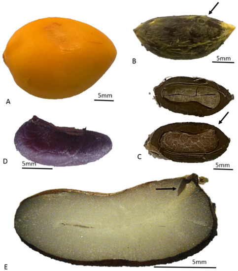 The rigid endocarp had a brown color and three longitudinal scars, with an operculum between each scar (Figure 1B). The seed had a brown surface with recesses and an appendage facing one of the opercula (Figure 1C). Regarding the seed, it displayed bilateral symmetry and a longitudinal scar in the area of the operculum (Figure 1D). The endosperm, which is white, had a central cavity forming an axis where the haustorium develops [28]. The zygotic embryo was located at one end of the axis, near the operculum (Figure 1E).