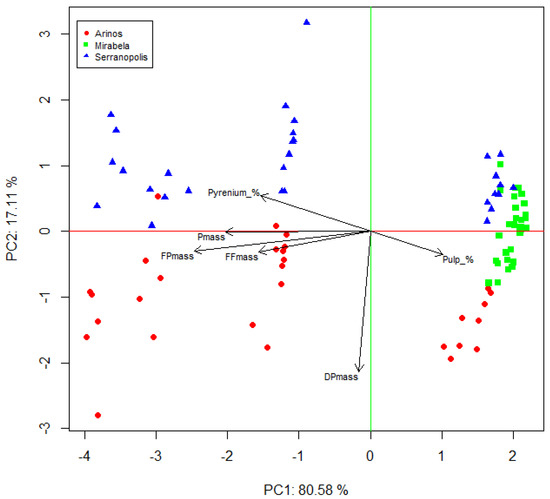 The principal component analysis (PCA) revealed that the two main components explain 97.69% of the total variation. Figure 2 presents a biplot illustrating these two main components. The ‘Mirabela’ group appears to be more restricted as having individuals that are quite homogeneous with each other, displaying a relatively high pulp percentage but smaller fresh fruit and pulp mass, as well as a lower pyrenium content compared to the individuals in the ‘Arinos’ and ‘Serranópolis’ groups. The ‘Serranópolis’ group exhibits similarities to the Arinos group, except for a lower dry pulp mass compared to the latter. Finally, concerning the ‘Arinos’ group, it demonstrates the highest dry pulp mass compared to the ‘Mirabela’ and ‘Serranópolis’ groups. If the economic objective is to increase dry pulp mass, then the ‘Arinos’ population may be recommended as the most suitable group in terms of this variable.