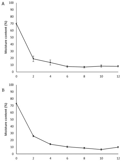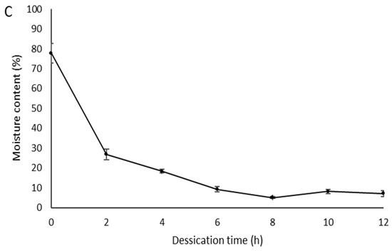 Moisture content of zygotic embryos of Butia capitata populations ((A): ‘Arinos’, (B): ‘Mirabela’ and (C): ‘Serranópolis’), as affected by the desiccation time.