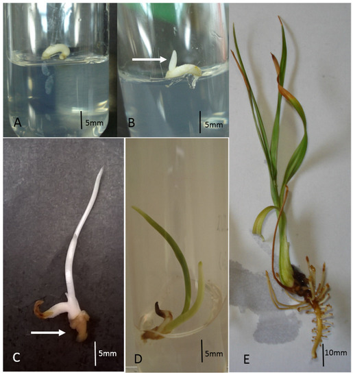 Stages of in vitro germination of Butia capitata. (A): Zygotic embryo 10 days after inoculation; (B): shoot protrusion; (C): seedling with developed shoot (arrow indicates radicle prominence); (D): pigmented shoot after exposure to light; (E): complete plant at 200 days after inoculation.