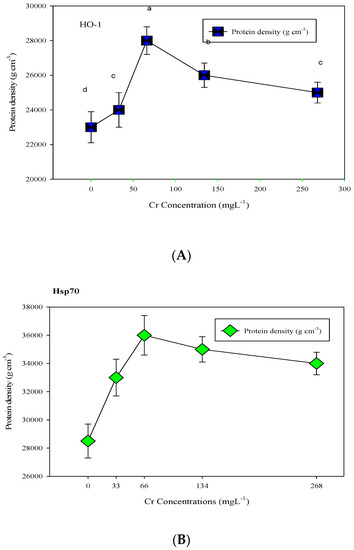 But the expression of HO-1 proteins in plants under maximum stress was higher than in other control and treated plants. The expression level of HSP70 was significantly high (p ≤ 0.05) against 50 mgL−1 and HO-1 protein at 100 mgL−1 of Cr stress (Figure 1).