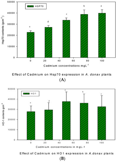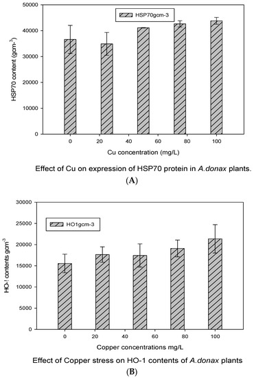 Similarly, the expression level of HO1 proteins was also stress-dependent, and almost all concentrations of Cu stress depicted various contents of HO1 proteins. It was observed that the HO-1 contents of giant reed were the minimum in control plants, but their amount at the maximum level of treatment was significantly higher. It showed that proteins HSP70 and HO-1 were significantly (p ≤ 0.05) affected by Cu stress at the maximum concentration of Cu exposure, more prominently as compared to control giant reed plants.