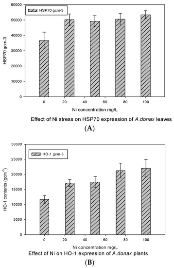 Under Ni treatments, the expression of HSP70 and HO-1 proteins showed significant variations in giant reed plants, as given in Figure 3. The results revealed that minimum HO-1 contents were found in control plants, which increased with metal treatment, and the level of HO-1 expression was almost equal at the first two treatment conditions (25 and 50 mgL−1). The maximum HO-1 contents were observed for the maximum concentration of Ni (100 mgL−1), which was significantly higher than the HO-1 contents found in control plants.