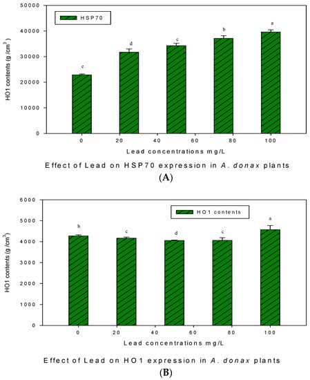 The mean HO-1 contents appeared at 75 mgL−1 exposure, while the maximum HO-1 contents were observed at 25 mgL−1 and 100 mgL−1 concentrations of Pb. The expression levels of the HO-1 and HSP70 proteins under Pb stress were significantly different for (p ≤ 0.05) giant reed plants.