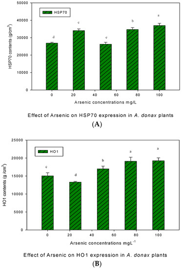 The effect of As stress on the expression level of the HSP70 and HO-1 proteins in giant reed plants is given in Figure 6. The expression of the HSP70 protein was stress dependent and increased with increasing concentrations of As stress. HSP70 contents were not expressed in control plants, but their expression was high for all As treated plants. It was observed that HSP70 contents were high at the maximum treatment level (100 mgL−1). The expression level of HO1 proteins also responded to various As concentrations and it was noticed that the minimum HO-1 contents were found in the control and at 25 mgL−1.