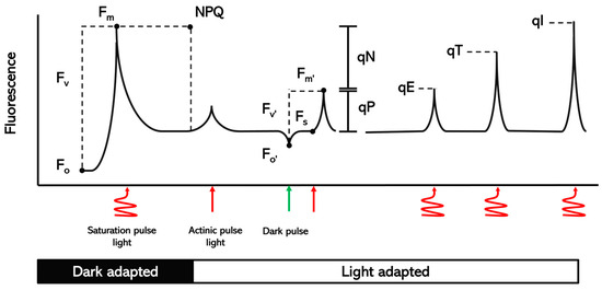 Schematic of the different parameters of chlorophyll fluorescence measured in dark-adapted and light-adapted plants.