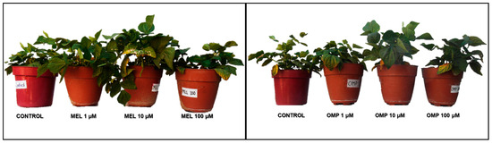As for the role of MEL, it is believed that one of the mechanisms driving the photosynthetic process is ionic balance in the cytosol, especially in the vegetative growth stage, by increasing the uptake of potassium and calcium ions [35]. Additionally, according to [36], the presence of MEL affects the expression of the genes responsible for photosynthetic pigment biosynthesis. More importantly, it has been reported to down-regulate the production of chlorophyllase, the enzyme responsible for chlorophyll degradation [37]. Finally, the improvement in photosynthetic activity of the treatments compared to the control is due to different protective mechanisms that OMP and MEL molecules trigger inside the plant, leading to an improvement in the efficiency of light utilization for transformation into energy.