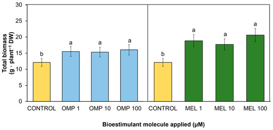 Effect of foliar application of omeprazole (OMP) and melatonin (MEL) at doses of 1, 10, and 100 µM on total biomass accumulation in green bean plants cv. Strike. Means with equal letters do not differ according to LSD test (p < 0.05).