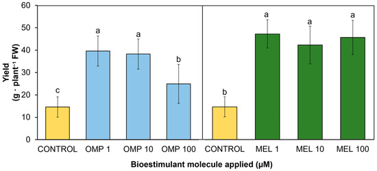 Similarly, MEL has been linked to the regulation of endogenous growth promoters such as auxin. This regulation has described accelerated growth in the root zone. When root architecture is modified by MEL action, nutrient and water uptake is promoted [31]. Adequate mineral supply and proper water uptake ultimately leads to increased yield and plant capacity to produce biomass. As shown in Figure 3 and Figure 4, plants with the highest biomass accumulation were able to produce the highest amount of yield (r = 0.6859 **). In addition, application at the lowest doses (1 µM) of both OMP and MEL were the most effective in increasing yield—by 1.8 and 2.2 times, respectively—with respect to the control, with a 100-fold lower dose.