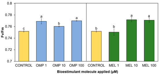 Effect of foliar application of omeprazole (OMP) and melatonin (MEL) at doses of 1, 10, and 100 µM on chlorophyll fluorescence (Fv/Fm) in green bean plants cv. Strike. Means with equal letters do not differ according to LSD test (p < 0.05).