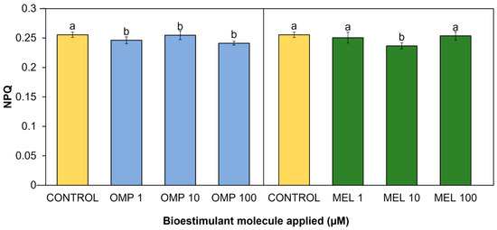 Through the thermal dissipation contained in PSI and PSII, the plant avoids inactivation of the photosynthesis process or damage caused by excess energy. This thermal dissipation is known as non-photosynthetic quenching (NPQ), and its quantification can be an important index to measure the health of the photosynthetic system in plants [48]. Significant differences (p < 0.05) in the present work were found in the non-photochemical quenching coefficient due to the effect of applying OMP and MEL at different doses (Figure 8). The treatment with the lowest value was MEL 10, with a significant decrease of 7.4% with respect to the control. On the omeprazole side, the lowest index was obtained in the OMP 100 treatment, with a significant decrease with respect to the control of 5.6% (Figure 8).