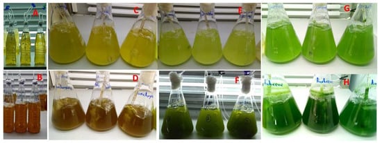 Representative images of the cultures of the 4 microalgae shot at various days of their culture period. (A,B): Amphidinium carterae on the 2nd and 10th day, respectively. (C,D): Isochrysis galbana on the 2nd and 9th day, respectively. (E,F): Nephroselmis sp. on 2nd and 8th day, respectively. (G,H): Anabaena sp. on the 3rd and 9th day, respectively.