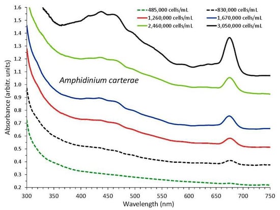 Absorption spectra of Amphidinium carterae culture at different cell densities.