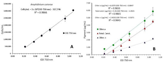 Correlation of algal density (A) and pigment concentration (B) with absorption (optical density-OD) at 750 nm in Amphidinium carterae culture. Values are means of 3 replicates ± SD.