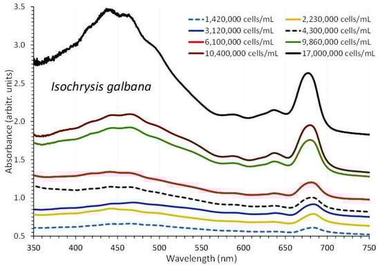 Absorption spectra of Isochrysis galbana culture at different cell densities.