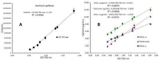 Correlation of algal density (A) and pigment concentration (B) with absorption (Optical Density-OD) at 750 nm in Isochrysis galbana culture. Values are means of 3 replicates ± SD.