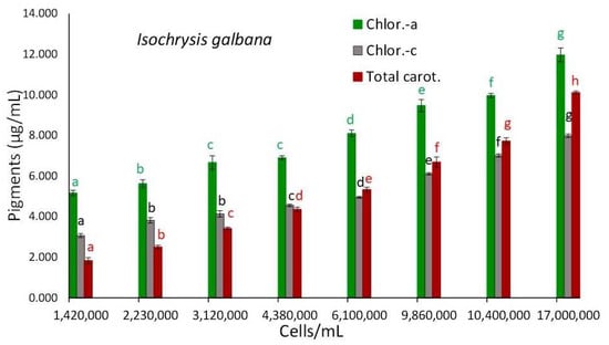 Pigment content in μg/mL of Isochrysis galbana culture at different cell densities. Values are means of 3 replicates ± SE. Different letters above each bar with the same color as the relevant pigment bar denote statistically different values (p < 0.05) among the different culture densities for the particular pigment. Same letters denote no difference (p > 0.05).
