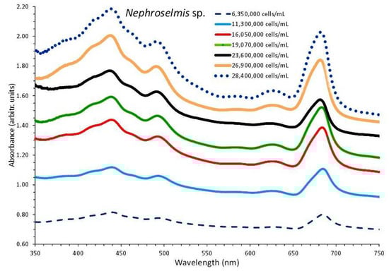 Absorption spectra of Nephroselmis sp. culture at different cell densities.