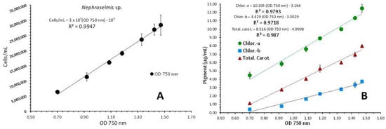 Correlation of algal density (A) and pigment concentration (B) with absorption (Optical Density-OD) at 750 nm in Nephroselmis sp. culture. Values are means of 3 replicates ± SD.