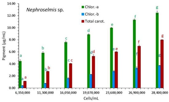 Pigment content in μg/mL of Nephroselmis sp. culture at different cell densities. Values are means of 3 replicates ± SE. Different letters above each bar with the same color as the relevant pigment bar, denote statistically different values (p < 0.05) among the different culture densities for the particular pigment. Same letters denote no difference (p > 0.05).