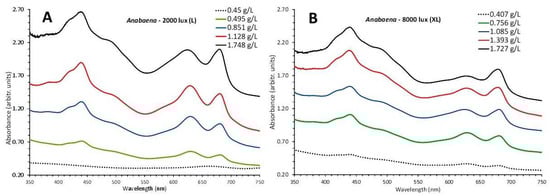 Absorption spectra of Anabaena sp. culture at different dry weights and light intensities, (A) 2000 lux (L), (B) 8000 lux (XL).