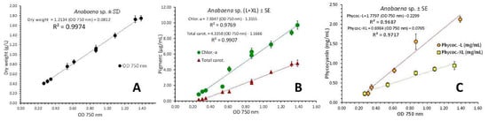 are both very predictive as indicated by their very high Pearson’s coefficient (R2 > 0.97). The corresponding equations for phycocyanin—OD 750 nm relation (Figure 12C) were calculated separately for “L” and “XL” illumination and resulted in: