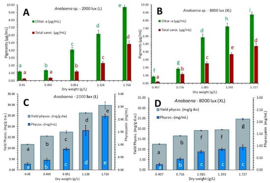 Pigment content in μg/mL of chlorophyll-a and, total carotenoids in (A): 2000 lux (L) and (B): 8000 lux (XL) and phycocyanin in mg/mL and phycocyanin yield in mg/g d.w. in (C): 2000 lux (L) and (D): 8000 lux (XL) of Anabaena sp. culture at different culture densities in g/L. Values are means of 3 replicates ± SE. Different letters with the same color as the relevant pigment bar above, or inside each bar, denote statistically different values (p < 0.05) among the different culture densities for the particular pigment across all treatments. Same letters denote no difference (p > 0.05).