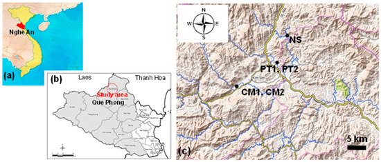 Que Phong District is located in the northwest corner of Nghe An Province, facing the boundaries of Laos and Thanh Hoa Province, Vietnam, to the west and north, respectively, and is designated as a biosphere reserve by UNESCO (Figure 2a,b). This area is surrounded by high mountain ranges, including a river network flowing down to the district center, forming the Hieu River.