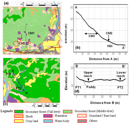 Vegetation map with the localities of C. quephongensis; (a) CM, (b) lateral view of A–A′ in Co Muong, (c) PT, and (d) lateral view of B–B′ in Phuong Tien. Black dots indicate the localities of C. qupephongensis grown. Bare lands surrounded by red-dotted circles indicate the traces of slope failure.