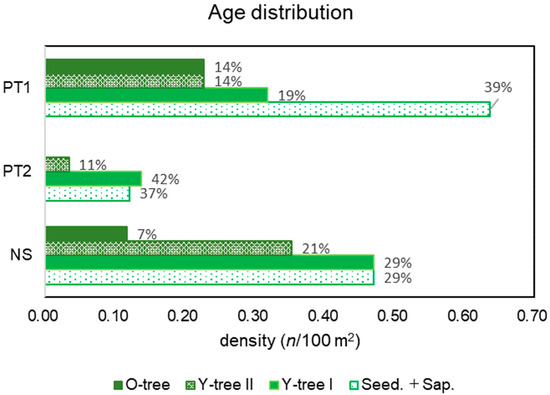 PT included heterogeneous habitats and their age distribution patterns differed; that of PT1 was pyramid shaped with 39% of Seed. + Sap., whereas PT2 was inverted and pyramid-shaped and lacked O-trees (Figure 6). This implies that PT is expanding in population size, whereas PT2 is shrinking.