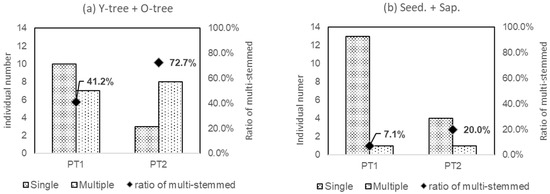 Ratio of multi-stemmed individuals in PT1 and PT2. a and b are for Y-tree + O-tree, respectively.