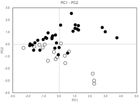 Sample score plot of C. quephongensis growing in PT1 and PT2 patches on the PC1–PC2. Black and white circles correspond to individuals in PT1 and PT2, respectively. PC1 and PC2 represent variabilities in tree height, crown size (smaller–larger), and growth pattern (single stem with large diameter–multi-stems with less diameter), respectively.