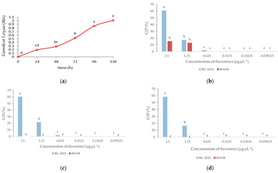 Growth Inhibition Percentage (GIP) of the fungus Sarocladium oryzae testing different concentrations of crude ethanolic extracts of two N. tabacum accessions (Nic 1015 and BHmN). (a) Growth of S. oryzae expressed in absorbance (Abs) at 595 nm; (b) GIP after 24 h of incubation. (c) GIP after 48 h of incubation; (d) GIP after 72 h of incubation. Means with different letters have statistically significant differences (a) One-way ANOVA n = 4 and (b–d) ANOVA, Tukey HSD, p ≤ 0.05, n = 4 with bifactor statistical treatment comparing concentrations and tobacco accessions, the data were transformed according to y’ = 2 × arcsine (y/100)0.5.