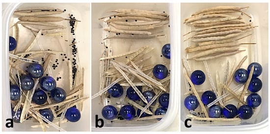 Results of a random impact test using marbles on (a) wildtype and (b,c) gene-edited lines containing LOF alleles. Lines shown are considered near-isogenic, with gene-edited lines having been selected for specific genotypes in the target locus from the precision gene editing process. Lines with known gene edits perform more favorably in a random impact test compared to wildtype, as evidenced by visual observation of greater levels of seed dispersal and broken pods in the wildtype tray compared to trays containing gene-edited lines.