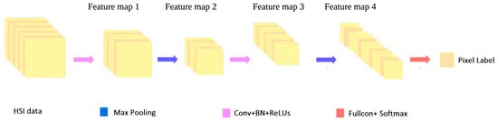 The method for feature extraction extracts attributes from segmented data based on colors, textures, and shapes [10]. Area, angle, and axis are shape-based properties [26]. Figure 2 shows a CNN feature extraction framework for HSI data, which includes convolution layers, pooling layers, and a fully dense layer.